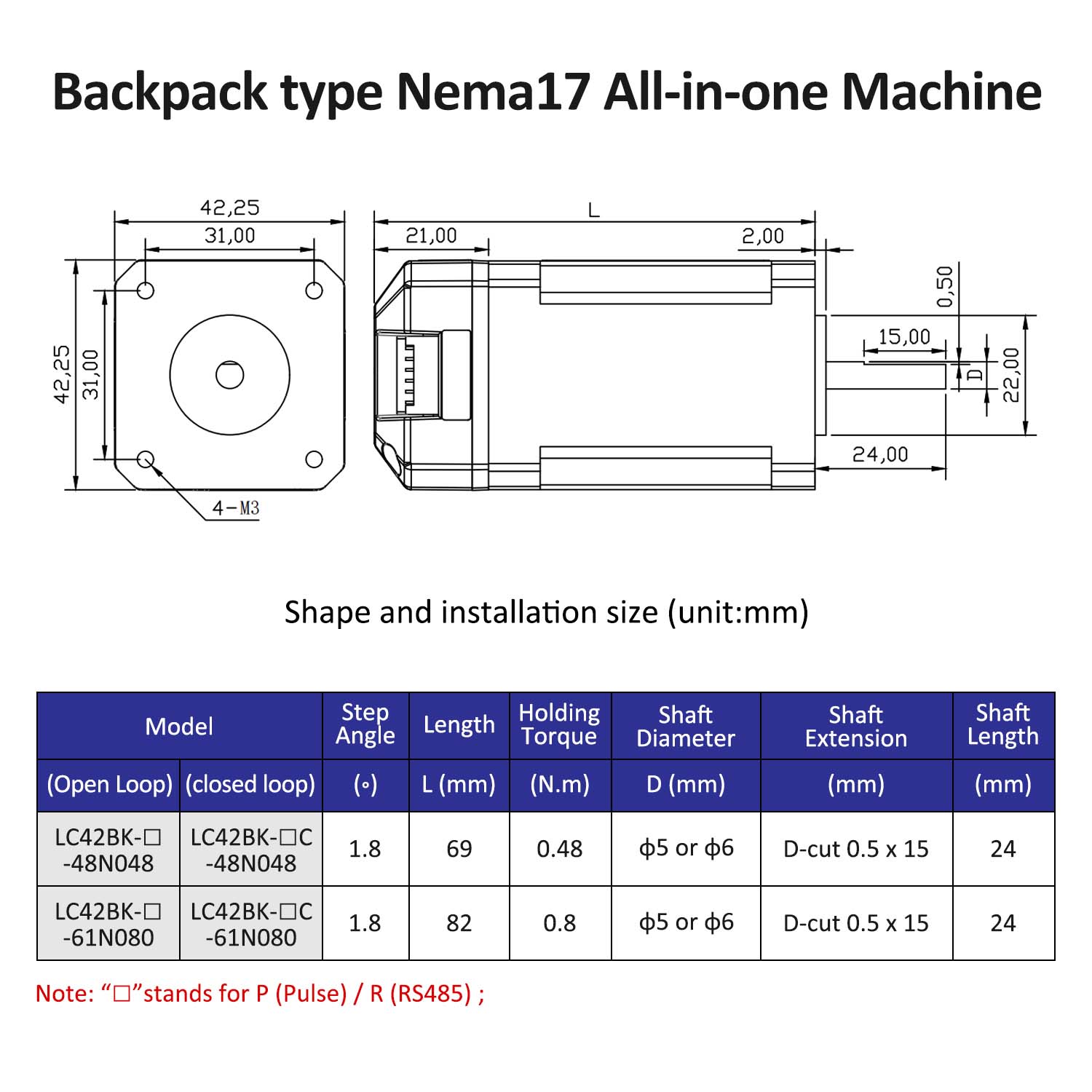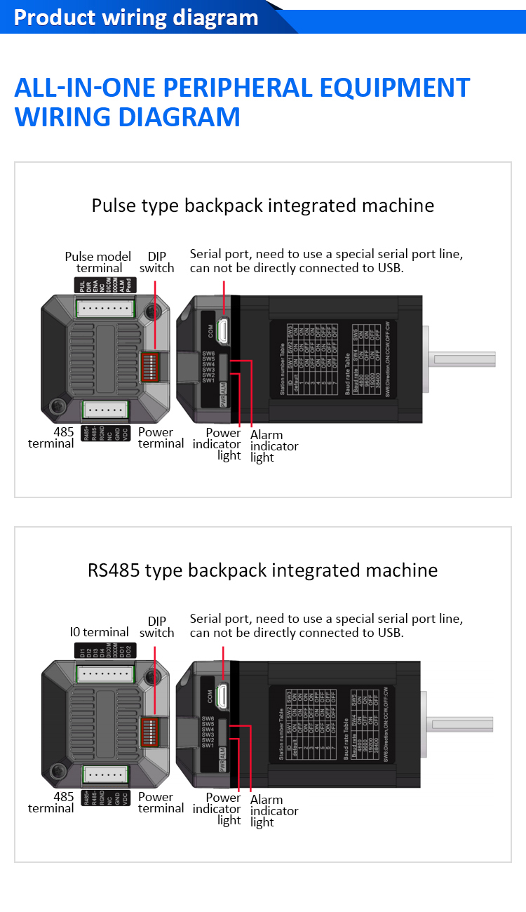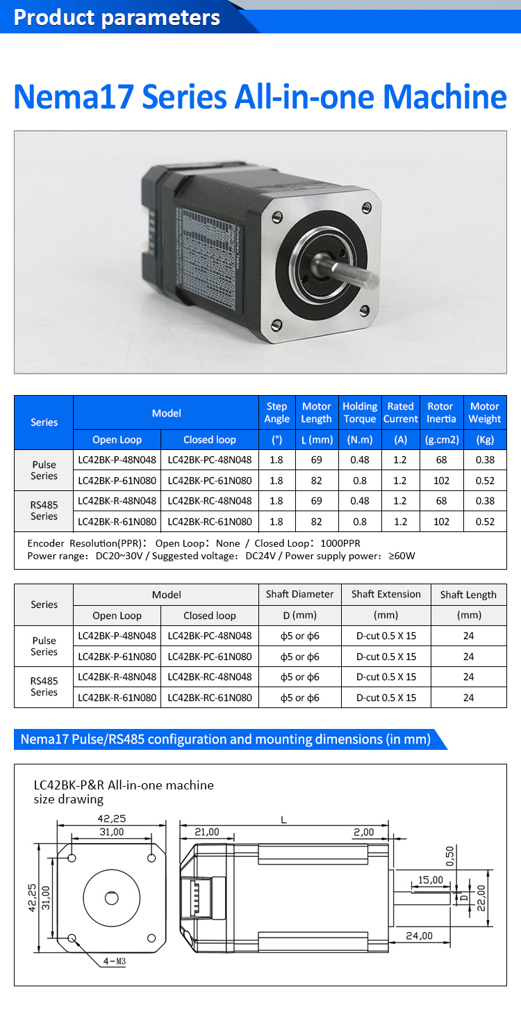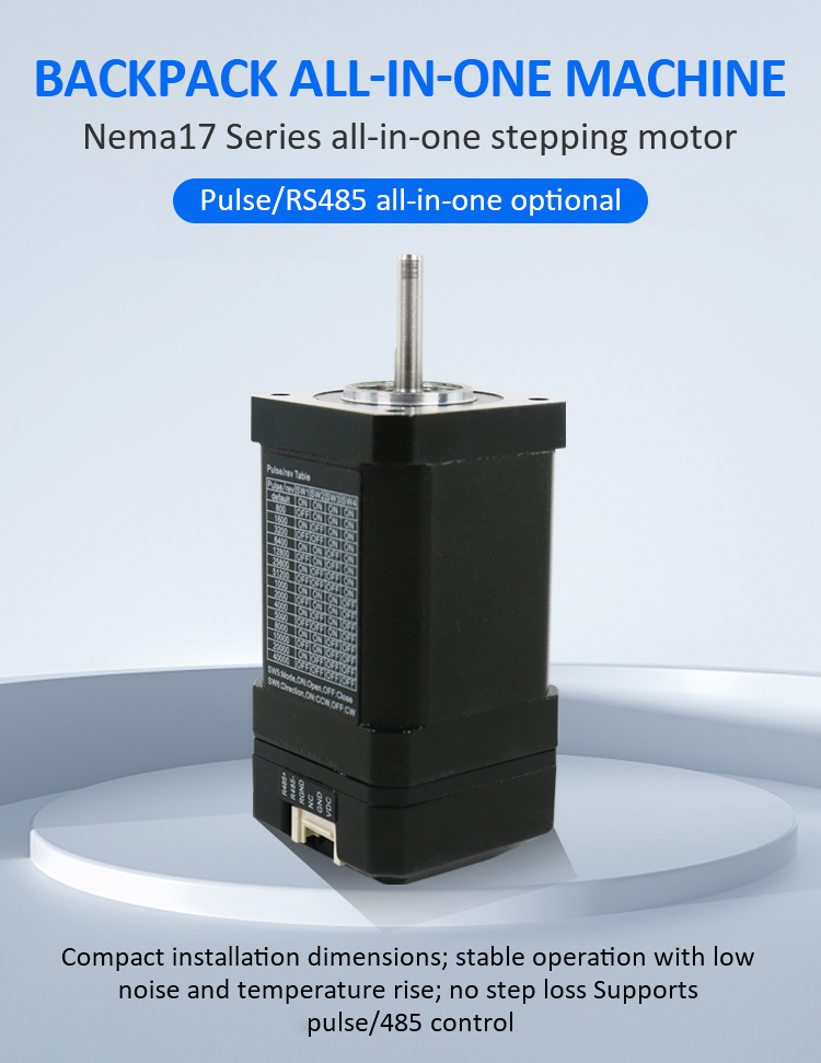 Sırt çantası tipi NEMA17 Açık Döngü Kapalı Döngü Entegre Step Motor. Nabız/rs485 kontrolüne sahiptir. Pulse/RS485 hepsi bir arada alarm işleme programı. Lownoise ve sıcaklık artışı ile kararlı çalışma, adım kaybı desteklenmez. Alan tasarruflu hepsi bir arada step sistemi kurulumu basitleştirir. Adım açısı: 1.8 Adım açısı. Tork tutma 0.48/0.8n.m. Kodlayıcı çözünürlüğü (PPR): Açık Döngü: Yok / Kapalı Döngü: 1000ppr. Güç Aralığı: DC20 ~ 30V/Önerilen Voltaj: DC24V/Güç Kaynağı Güç: ≥60W. Biz orijinal fabrikayız, CE, ROHS sertifikamız var.